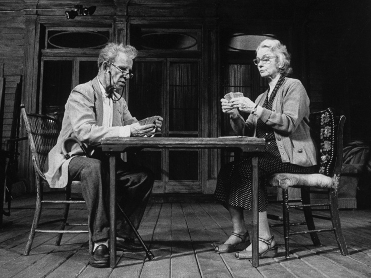 That play, The Gin Game, premiered in Los Angeles in September 1976. The two-character drama centers on two elderly residents of a nursing home who form a complicated bond while playing gin rummy. After the premiere’s positive reception, the play was produced at the Actors Theatre of Louisville, where it was discovered by married actors Hume Cronyn and Jessica Tandy, who brought The Gin Game to Broadway under the direction of Mike Nichols. The production ran for more than 500 performances and garnered four Tony Award nominations with Tandy winning for Best Actress in a Play. Coburn won the 1978 Pulitzer Prize for Drama.